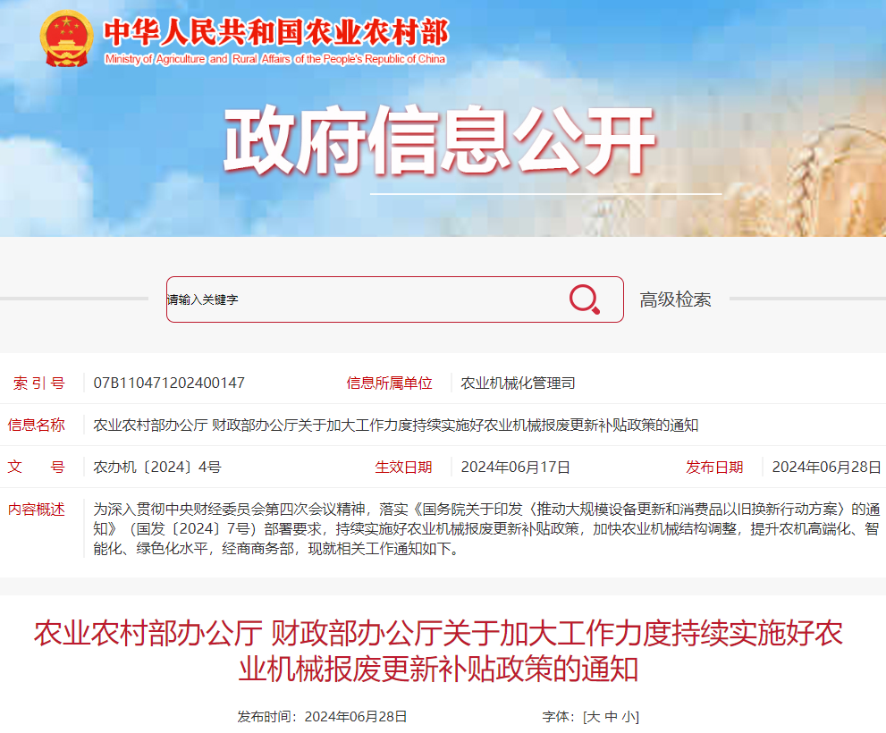 農(nóng)業(yè)農(nóng)村部等部門關(guān)于加大工作力度持續(xù)實(shí)施好農(nóng)業(yè)機(jī)械報(bào)廢更新補(bǔ)貼政策的通知(最高可領(lǐng)3萬元)