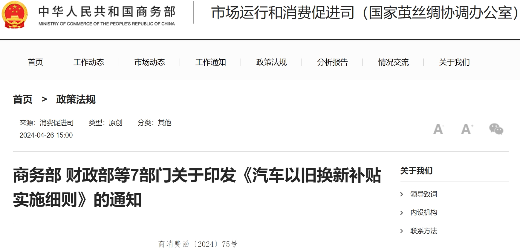 商務(wù)部財務(wù)部等7部門關(guān)于印發(fā)《汽車以舊換新補貼實施細則》的通知
