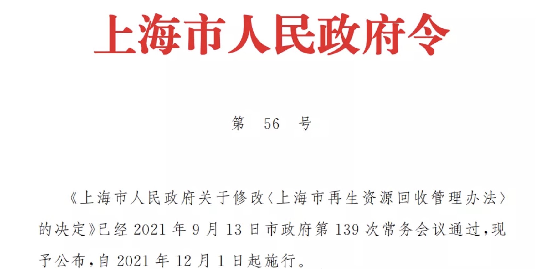 《上海市人民政府關(guān)于修改〈上海市再生資源回收管理辦法〉的決定》已經(jīng)2021年9月13日市政府第139次常務(wù)會(huì)議通過(guò),現(xiàn)予公布,自2021年12月1日起施行。