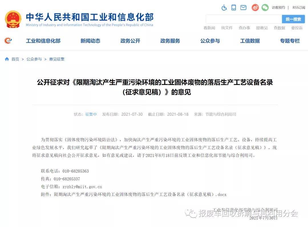 為貫徹落實(shí)《固體廢物污染環(huán)境防治法》,加快淘汰產(chǎn)生嚴(yán)重污染環(huán)境的工業(yè)固體廢物的落后生產(chǎn)工藝、設(shè)備,持續(xù)提高工業(yè)綠色發(fā)展水平,我們研究起草了《限期淘汰產(chǎn)生嚴(yán)重污染環(huán)境的工業(yè)固體廢物的落后生產(chǎn)工藝設(shè)備名錄(征求意見稿)》?,F(xiàn)將征求意見稿向社會(huì)公開征求意見,如有意見或建議,請(qǐng)于2021年8月18日前反饋工業(yè)和信息化部節(jié)能與綜合利用司。