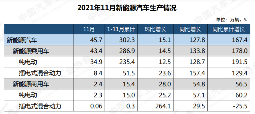 11月,新能源汽車產(chǎn)銷分別完成45.7萬輛和45萬輛,同比分別增長1.3倍和1.2倍。11月新能源汽車市場滲透率達(dá)到了17.8%,繼續(xù)高于上月,其中,新能源乘用車市場滲透率達(dá)到19.5%。陳士華表示,消費(fèi)者對新能源汽車接受度的不斷提升,推升了新能源汽車的銷量不斷刷新月度歷史記錄。