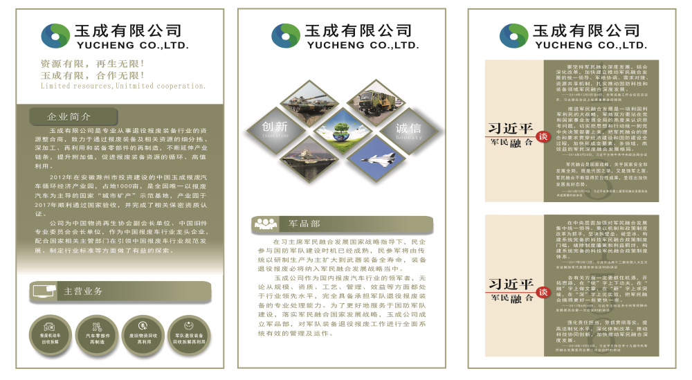 軍品部成立以來,以突出軍民融合、循環(huán)再生、綠色環(huán)保、可持續(xù)發(fā)展等特色,及時跟蹤了解退役裝備進展情況,先后進行黨建氛圍營造,軍品部宣傳手冊、退役裝備處理方案研究等系列準(zhǔn)備工作。
