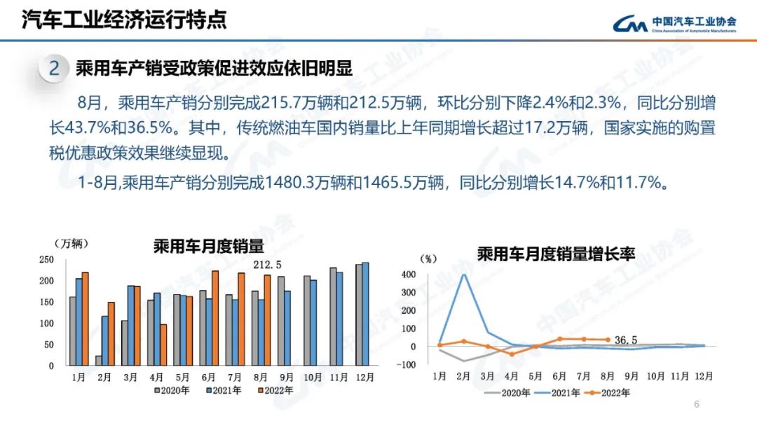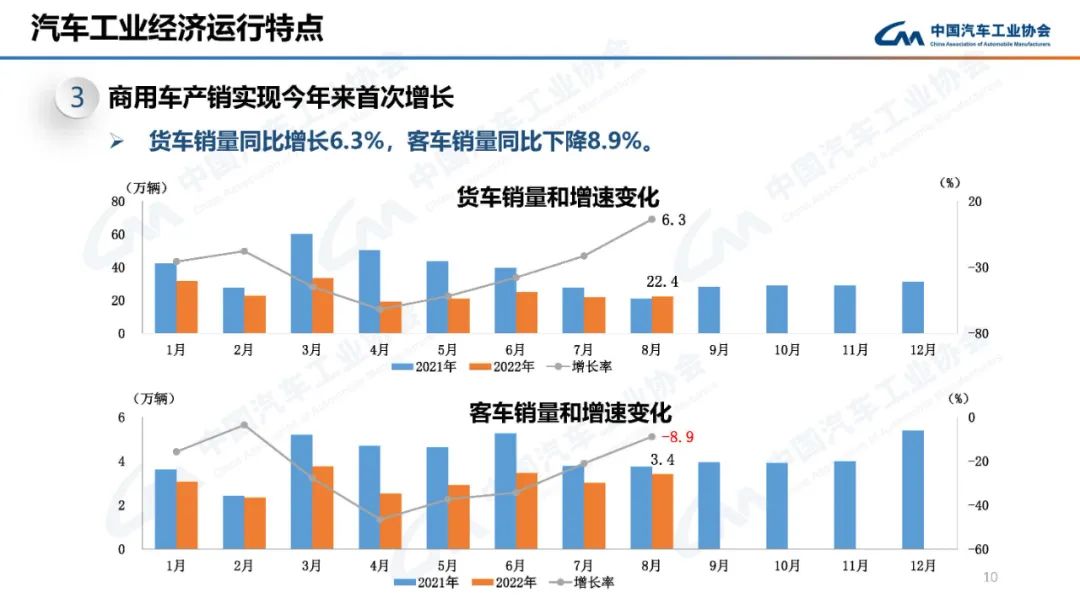 2022年8月,汽車產(chǎn)銷同比延續(xù)保持快速增長(zhǎng)勢(shì)頭,購置稅優(yōu)惠等促消費(fèi)政策持續(xù)發(fā)力,乘用車消費(fèi)企穩(wěn)上升,即使經(jīng)濟(jì)運(yùn)行有波動(dòng),消費(fèi)依然堅(jiān)韌,已逐步恢復(fù)到正常狀態(tài);商用車產(chǎn)銷實(shí)現(xiàn)今年以來首次同比增長(zhǎng);本月新能源汽車產(chǎn)銷、汽車出口同比均創(chuàng)歷史新高。